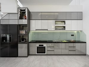 Cánh tủ bếp: vật liệu hiện đại rất đa dạng, nổi bật là acrylic bóng gương (mang đến vẻ sang trọng, chiều sâu), laminate (siêu bền, chống trầy xước, đa dạng vân gỗ, vân vải) và melamine (giá cả phải chăng, màu sắc phong phú).